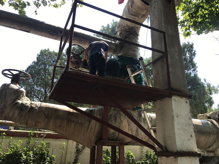 在鐵塔寺小區(qū)檢修現(xiàn)場,幾名檢修人員正頂著近36度的高溫對二次網(wǎng)管道的保溫進(jìn)行修補(bǔ)、更換。雖然天氣悶熱,但為了保證冬季供暖效果、減少不必要的損耗、確保設(shè)備狀態(tài)良好,他們加班加點,趕著在天黑之前完成此項檢修工作。